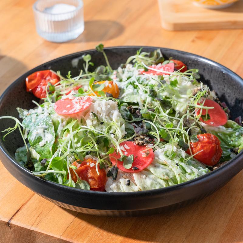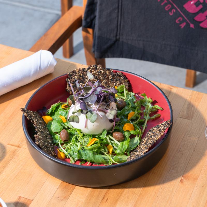 Organic burrata, wild arugula cherry tomatoes, house made seeds crackers